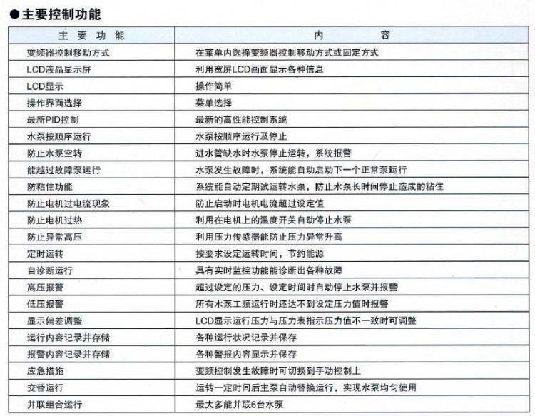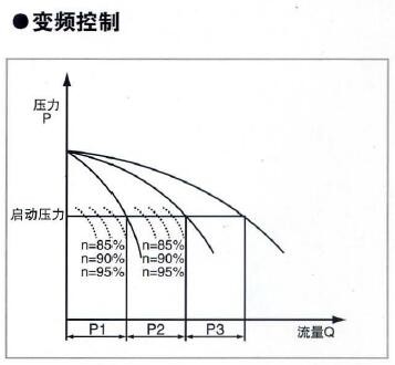 當管網壓力大子啟動壓力設定值時由與出水管路連接的壓力罐供水, 如果管網壓力等于啟動壓力設定值時啟動水泵,水泵運行中管網壓力達到停止壓力時停止水泵運行,*泵啟動后管網壓力超過啟動壓力,來達到停止壓力時水泵繼續運行;水泵全速運行后管網壓力未達到啟動壓力時水泵追加啟動。