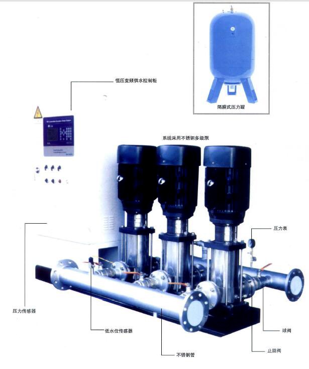 該恒壓變頻供水設備是由最新性能PID變頻控制柜和2臺以上水泵并聯組成的尖端加壓供水設備, 能夠自動調節以滿足用戶的恒壓變量供水要求。供水管網壓力保持恒定,整個供水系統始終保持高效節能的最佳狀態。供水方式有變頻供水和壓力供水兩種,變頻供水是自動調節某臺水泵的轉速或多臺水泵投入/退出運行,使供水管網壓力保持恒定的理想供水方式,操作簡單。