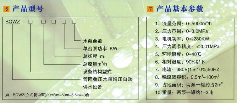 水是人類賴以生存的寶貴資源,尤其是飲用水資源更是直接與我們的生命和健康息息相關(guān),密不可分,飲用水的安全已成為全世界共同面對的問題,我廠儂靠自身強(qiáng)大的科研實力通過長期不懈的努力,在飲用水供水領(lǐng)域已取得較大的成績與突破,在十幾年前就在全國首先推出了無負(fù)壓變頻自動供水設(shè)備。在此基礎(chǔ)上又經(jīng)過多年的市場調(diào)查、應(yīng)用、反復(fù)研究、論證與推敲,我廠又研發(fā)出全國獨一無二,最為先進(jìn)、合理、科學(xué)、節(jié)能、環(huán)保的創(chuàng)新性產(chǎn)品, BQWZ型管網(wǎng)疊壓無負(fù)壓水箱增壓全能變頻自動供水設(shè)備,它的主要特點是吸取了管網(wǎng)疊壓無負(fù)壓、箱式無負(fù)壓設(shè)備的所杳優(yōu)點、功能,也同時解決以上設(shè)備中存在的所有不足與困惑,它的出現(xiàn),我們堅信它可以滿足全國各地在任何場合、任何條件都能安全可靠使用,而且更加節(jié)能環(huán)保。